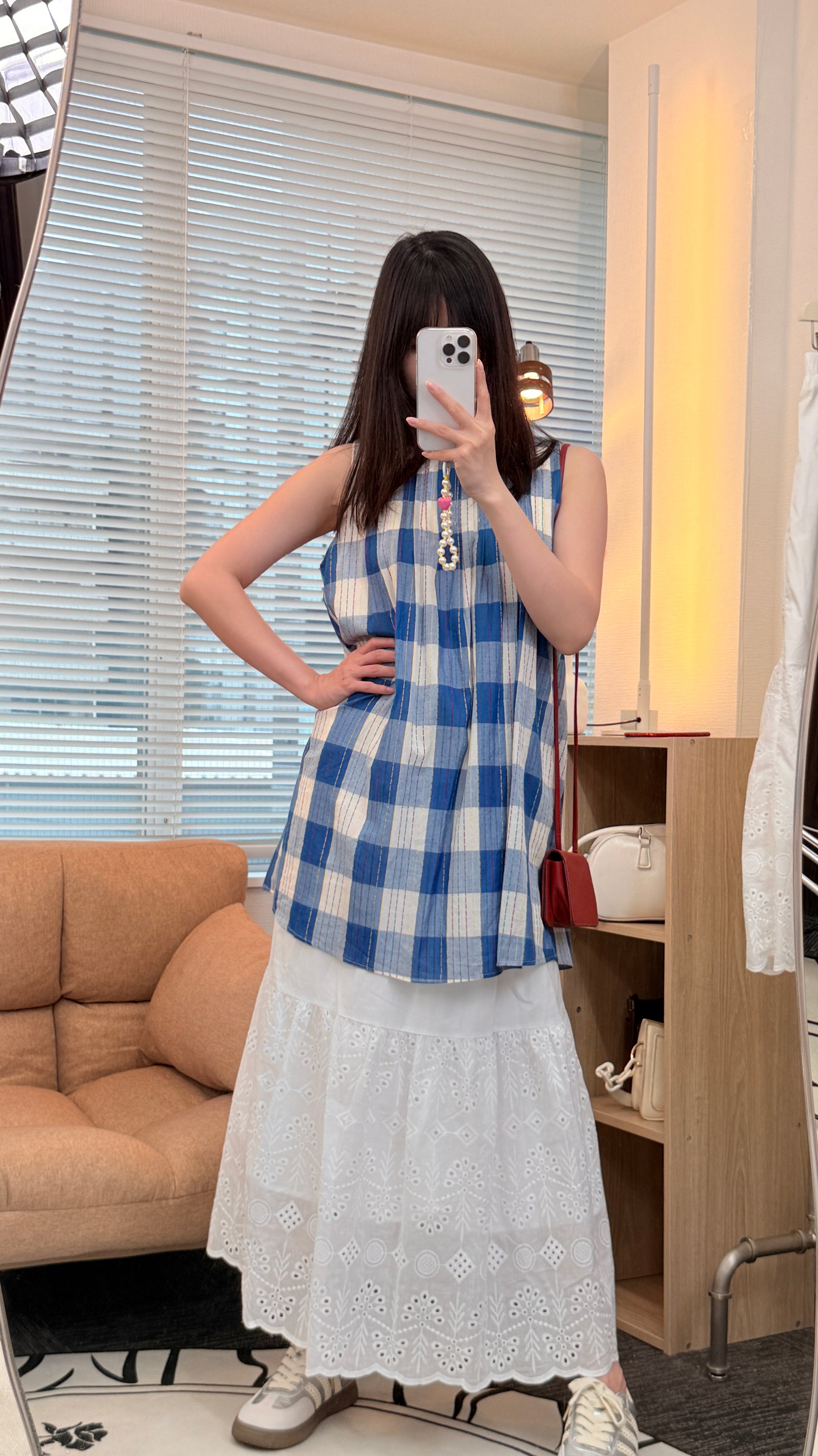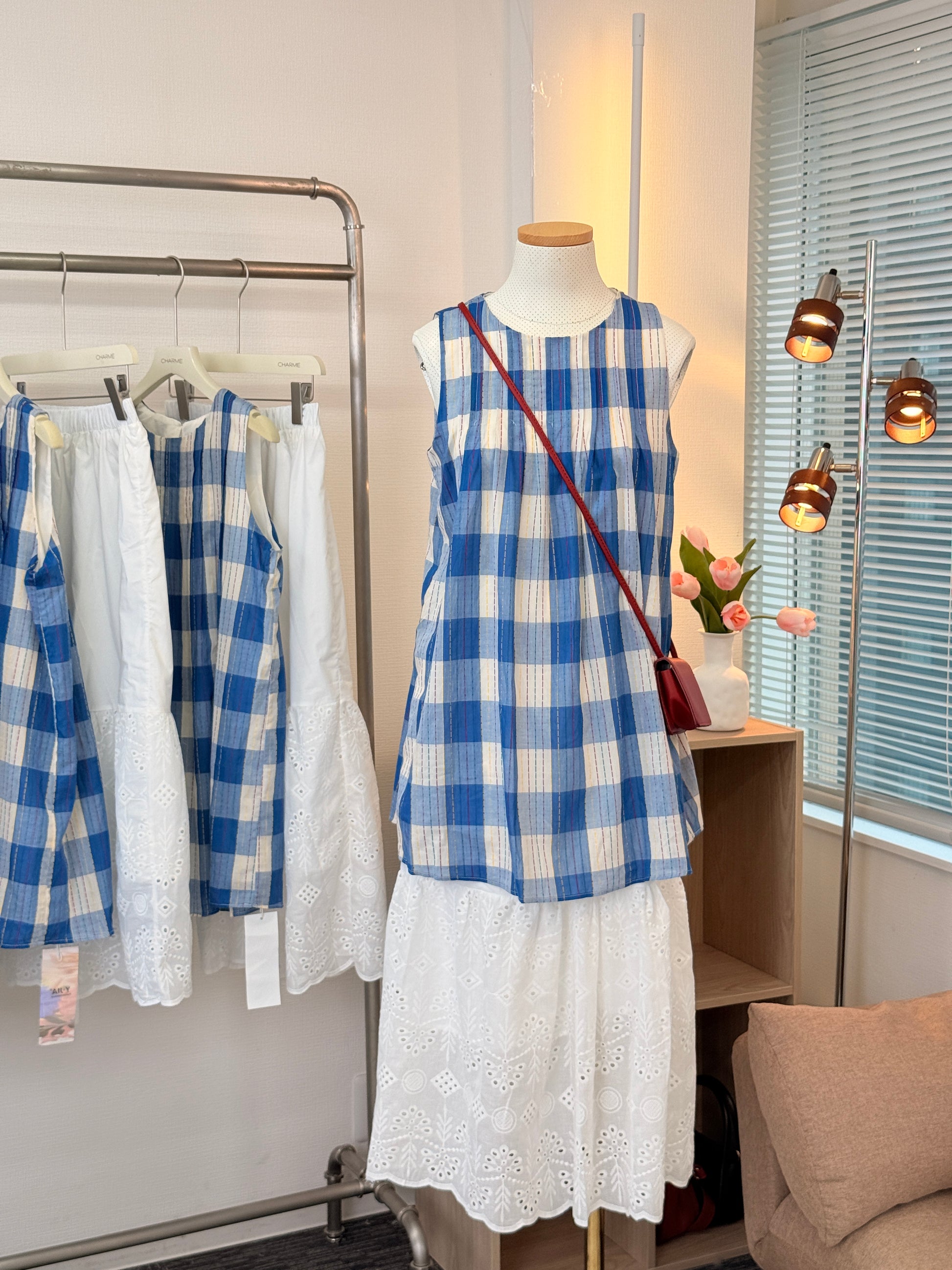 夏らしい爽やかなチェック柄と、繊細な刺繍レースを組み合わせた、CHARMEオリジナルのセットアップ。トップスはノースリーブのAラインシルエットで、胸元にたっぷりとギャザーを入れることで、体のラインを拾わず涼しげに着られます。